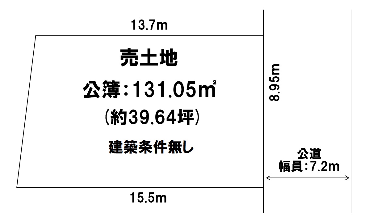 | 土地名称 | 大津市高砂町 | 建築条件 | 無し | 価格(坪単価) | 1480万円 | 面積:㎡(坪) | 公簿 131.05㎡(39.64坪) | 交通 | 京阪石山坂本線 滋賀里 徒歩10分 | 道路:幅員・間口 | 公道 幅員:7.2m 間口:8.9m | 私道 | セットバック | 地目 | 宅地 | 地勢 | 建ぺい率/容積率 | 60%/200% | 権利 | 所有権 | 都市計画 | 市街化区域 | 用途地域 | 1種住居 | 小学校 | 大津市立志賀小学校 徒歩10分(733m) | 中学校 | 大津市立唐崎中学校 徒歩26分(2010m) | 現況 | 更地 | 引渡し | 相談 | 規制 | 備考 |