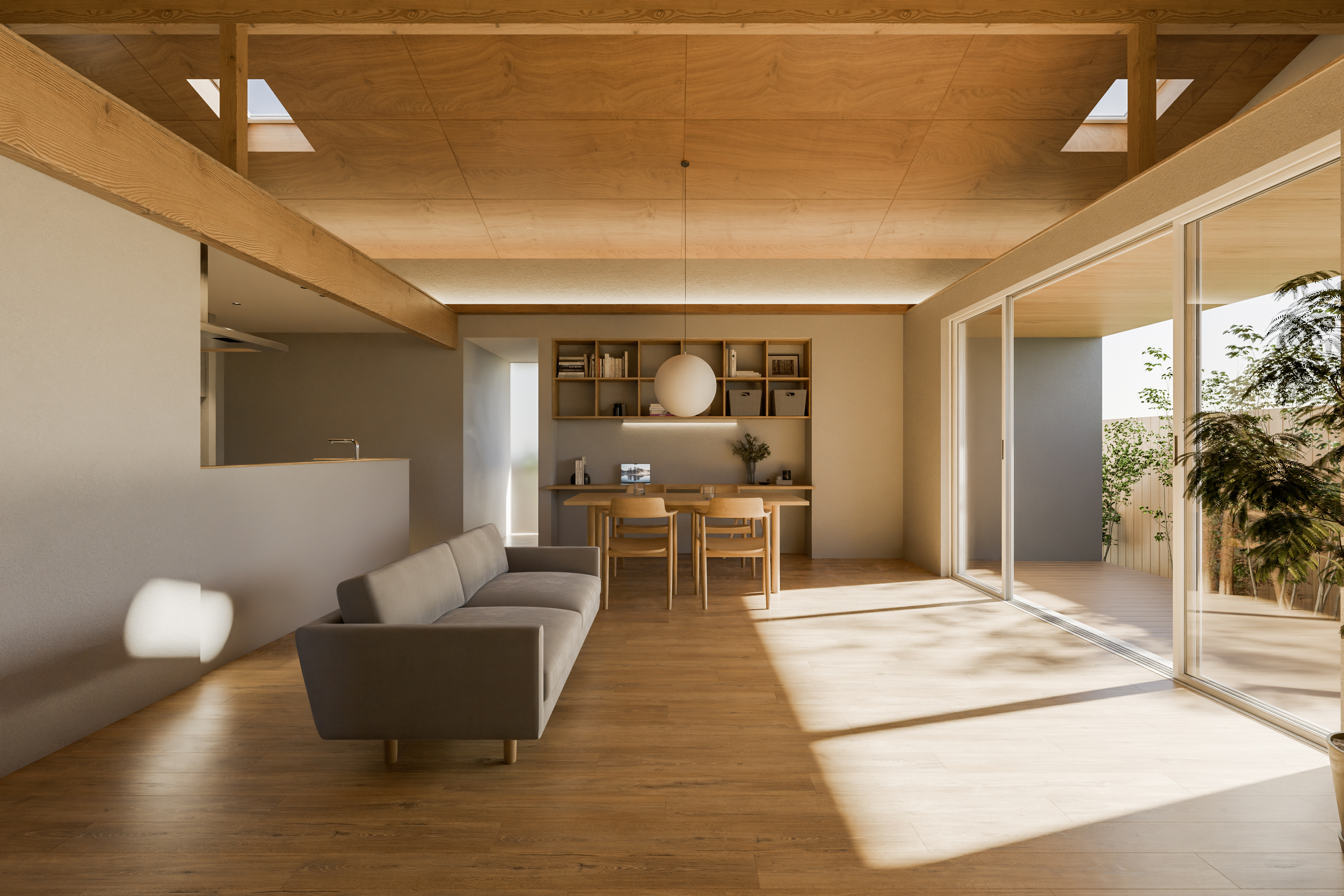 生活の様々なシーンを広々としたLDK、中間領域でつながる軒裏空間やロフト空間を存分に使い、家族が日々楽しく笑顔あふれる空間に。